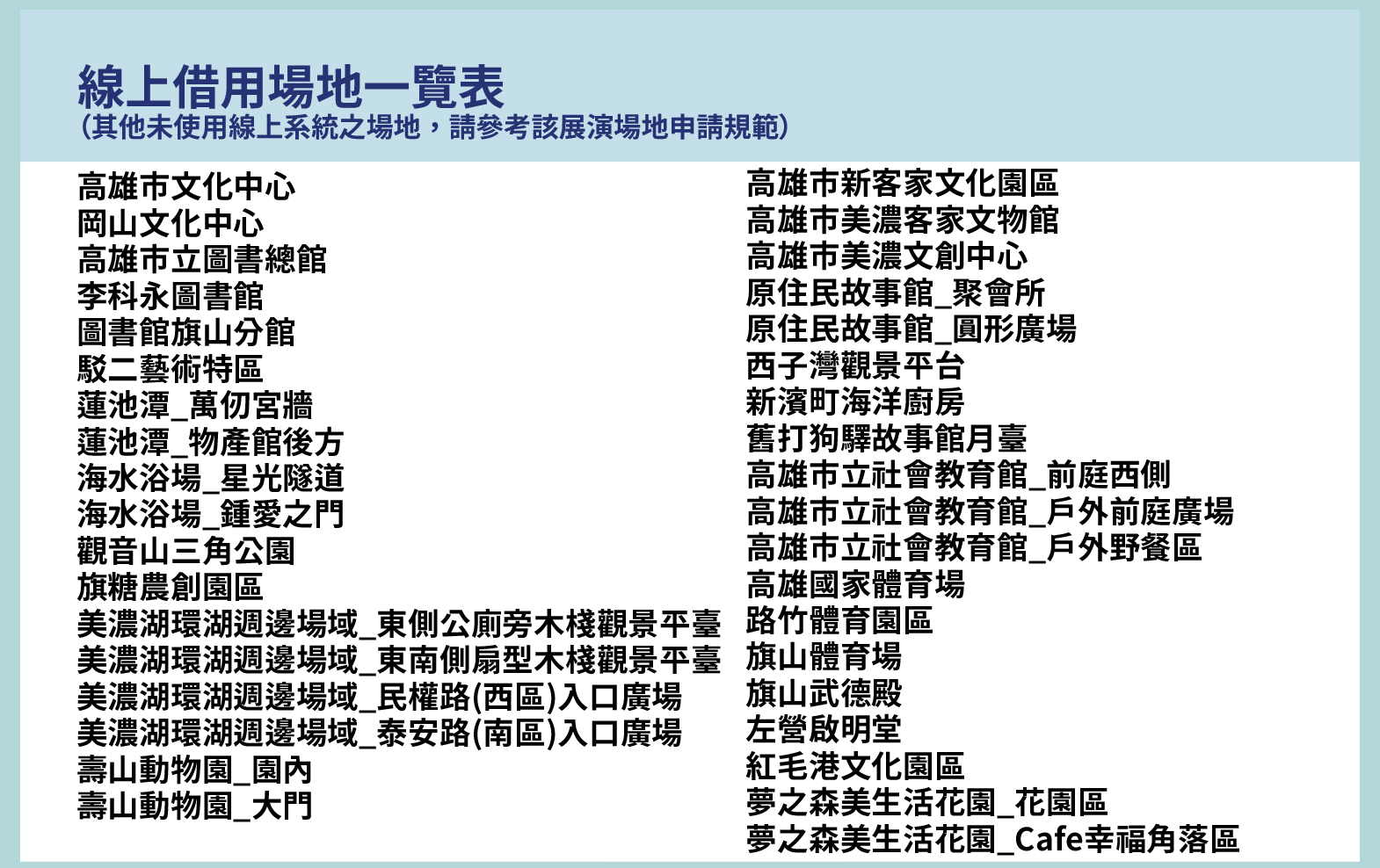 *網站系統自動功能: 公有場地申請,每週五早上10:00開放下一週場地申請,如該場地下方的「場地表演行程日誌」, 私有場地則按照該場地規範申請。 *檔案下載:線上免費借用場地一覽表(其他未使用線上系統之場地,請參考該展演場地申請規範) 補充1:街頭藝人可逕向管理單位提出表演申請,並由管理單位規範其演出內容。若無取得場地管轄單位允許,則無法在該場域演出。補充2:如非該平台場地 如公園場地,因高雄市公園管理自治條例第十九條第三項與第七項規定因素,採非常態性開放展演之管理方式。如對該場域有其他疑問,可逕與該管理單位—「高雄市工務局公園處」連繫。